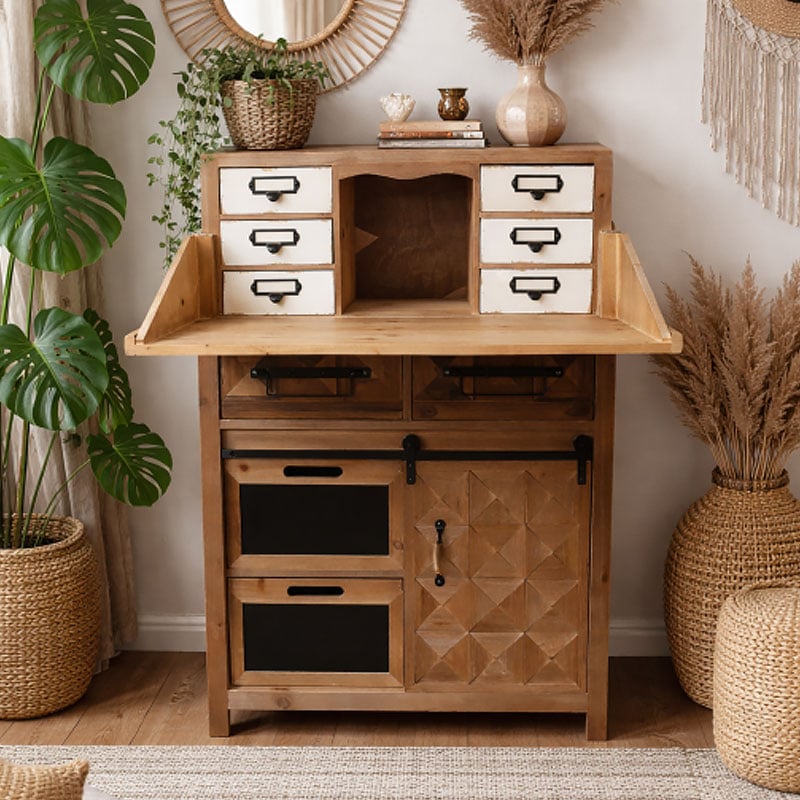 Boho Rustic Multi Drawer 1 Sliding Door Solid Light Fir Wood Apothecary Cabinet 106cm
